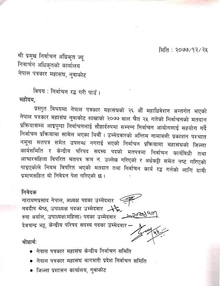 उम्मेदवारहरु अध्यक्ष पदका नारायणप्रसाद नेपाल, उपाध्यक्ष पदका नवदीप श्रेष्ठ, महिला उपाध्यक्ष रुपा अर्याल, कोषाध्यक्ष पदका गमला लामा र केन्द्रीय परिषद सदस्य पदका देवचन्द्र भट्टद्वारा हस्ताक्षरित छुट्टाछुट्टै निवदेनमा भनिएको छ “निर्वाचनको मतदान प्रक्रियासम्म आईपुग्दा निर्वाचनलाई सौहर्दरुपमा सम्पन्न निर्वाचन आयोगलाई सहयोग गर्दै निर्वाचन प्रक्रियामा सामेल भएका थियौ। उम्मेदवारको अन्तिम नामावली प्रकाशन पश्चात नमुना मतपत्र समेत उपलब्ध नगराई भएको प्रक्रियामा महासंघको जिल्ला कार्यसमिति र केन्द्रीय परिषद सदस्य पदको मतपत्रमा निर्वाचन कार्यविधी तथा आचारसंहिता नियम विपरित मतपत्र क्रम नम्बर उल्लेख गरिएको र अर्धकट्टी समेत नष्ट गरिएको पाईएको नियम बिपरित भएको मतदान तथा निर्वाचन कार्य रद्द गर्नको लागि दावी प्रमाणसहित यो निवेदन पेश गरिएको छ।”
