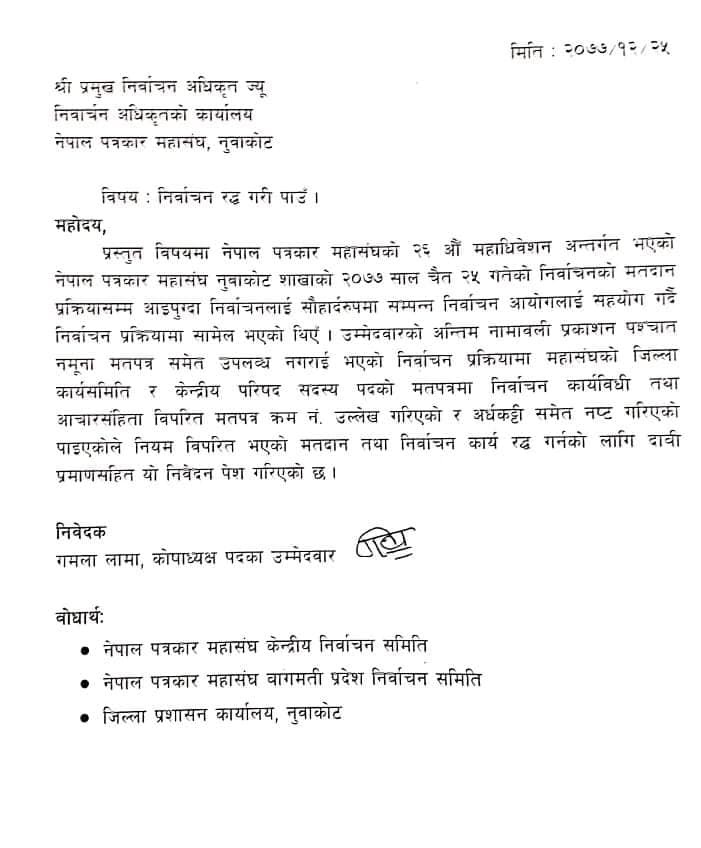 नुवाकोट – प्रेस चौतारी नेपाल, जनपत्रकार संगठन र स्वतन्त्र उम्मेदवारले तीन तहको मतदान मध्ये जिल्लाको मतदानका क्रममा मतपत्रमा संकेत राखेर मतदान गराइएकाले त्यो बदर हुनुपर्ने माग गर्दै निर्वाचन समितिमा उजुरी दिएका छन् ।